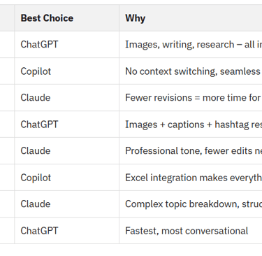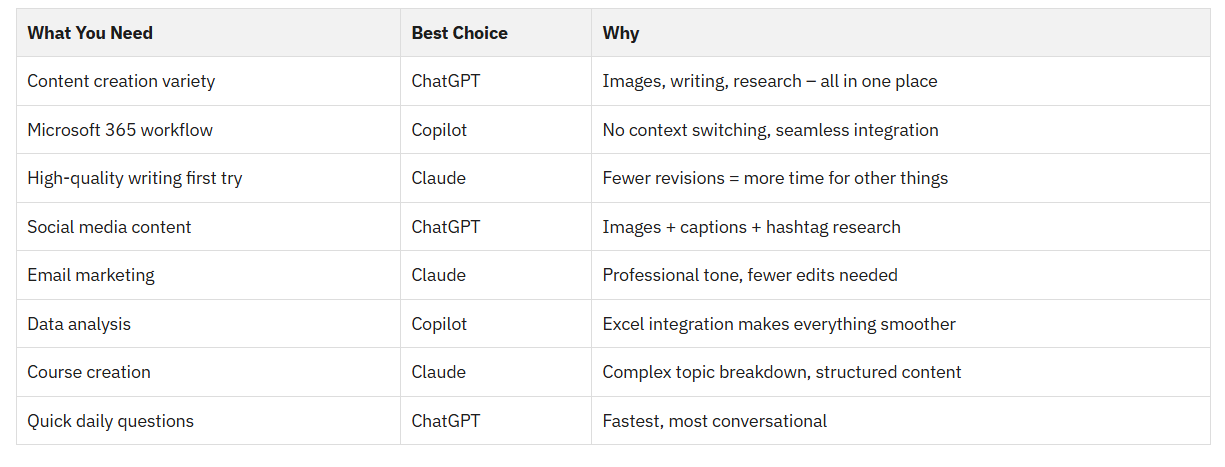 The short answer? It depends on how you actually work. ChatGPT wins for versatility queens who juggle everything, Copilot is perfect if you live in Microsoft-land, and Claude is your bestie for complex thinking tasks that need to be right the first time.